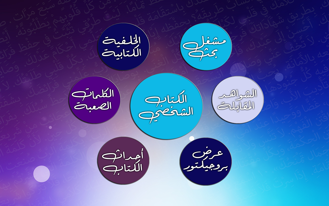 ابدأ الآن في استخدام "كتابك الشخصي" الذي يساعدك على دراسة الكلمة بطريقة مبسطة و شيقة. يمكنك من خلال "كتابك الشخصي" تلوين آيات الكتاب المختلفة بناءً على التصنيفات التي تريد أن تكونها، كما يساعدك في إضافة شواهد مقابلة للآيات التي تقوم بدراستها و وضع هوامش مكتوبة أو في صورة